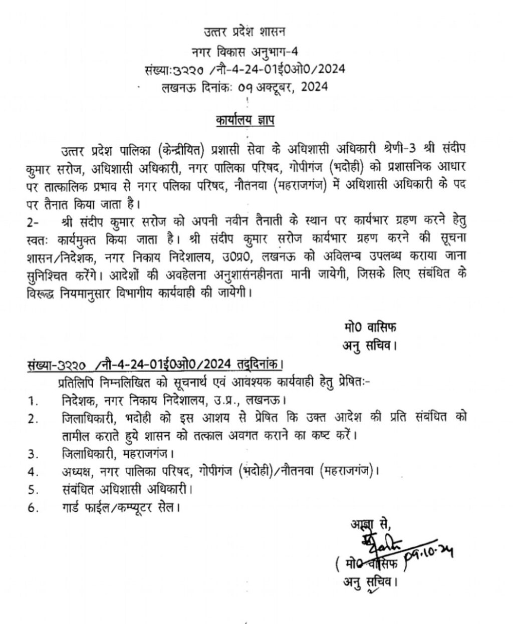 इससे पहले, संदीप कुमार सरोज नगर पालिका परिषद गोपीगंज, भदोही में अधिशासी अधिकारी के पद पर तैनात थे
